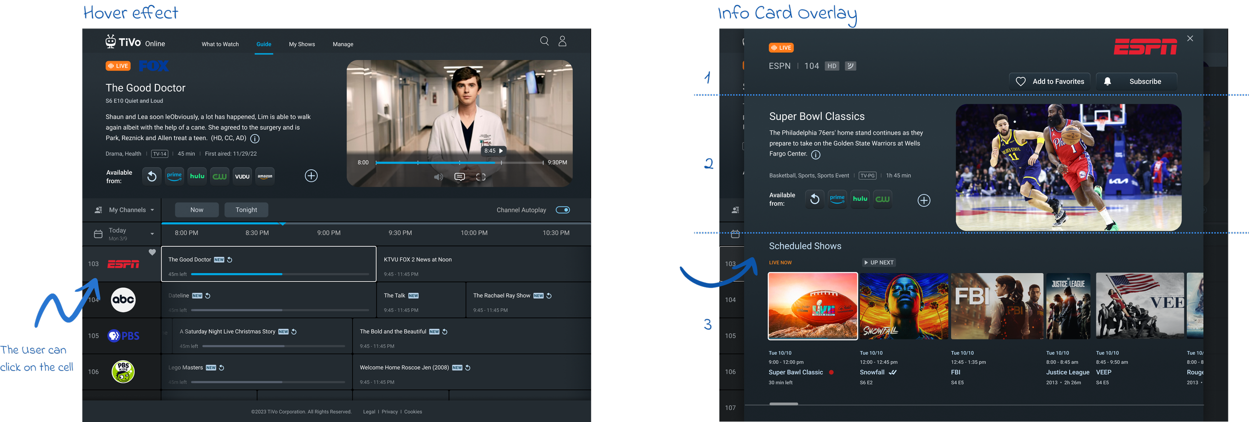 As the Lead Product Designer, I spearheaded the innovative redesign of TiVo's user experience, drawing upon extensive research and user feedback. My role was pivotal in conceptualizing the Channel Info Card—a user-centric overlay that enhances the guide browsing experience. This overlay, activated by a click on any channel cell, consolidates crucial information and provides necessary call-to-action (CTA) options that both users and providers have expressed a need for, such as favoriting channels and scheduling shows.