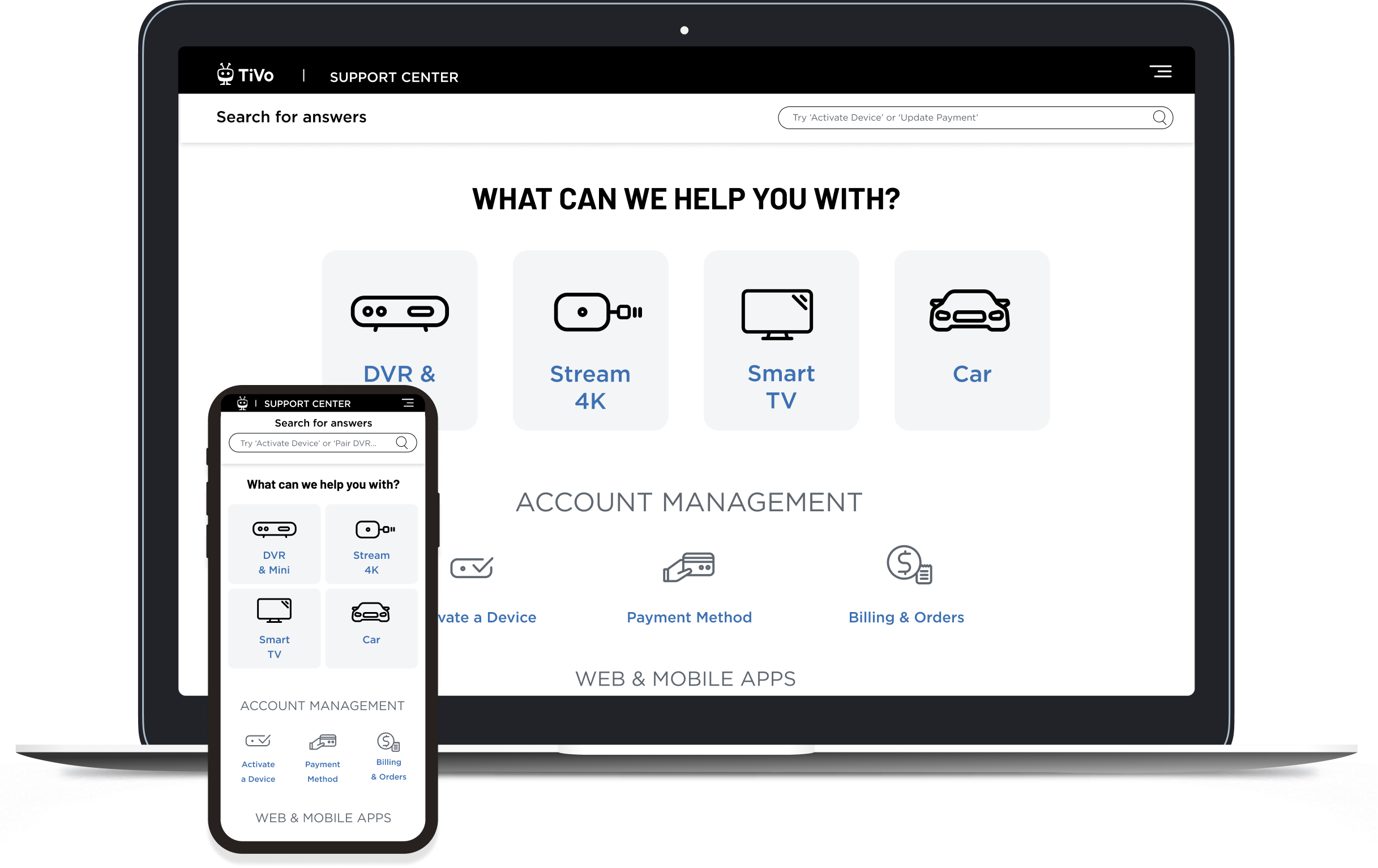 Redesigned the long-neglected TiVo Support Hub into a streamlined, user-friendly ‘self-serv’ experience, aligned with major product launches like TiVo OS and TiVo Car.