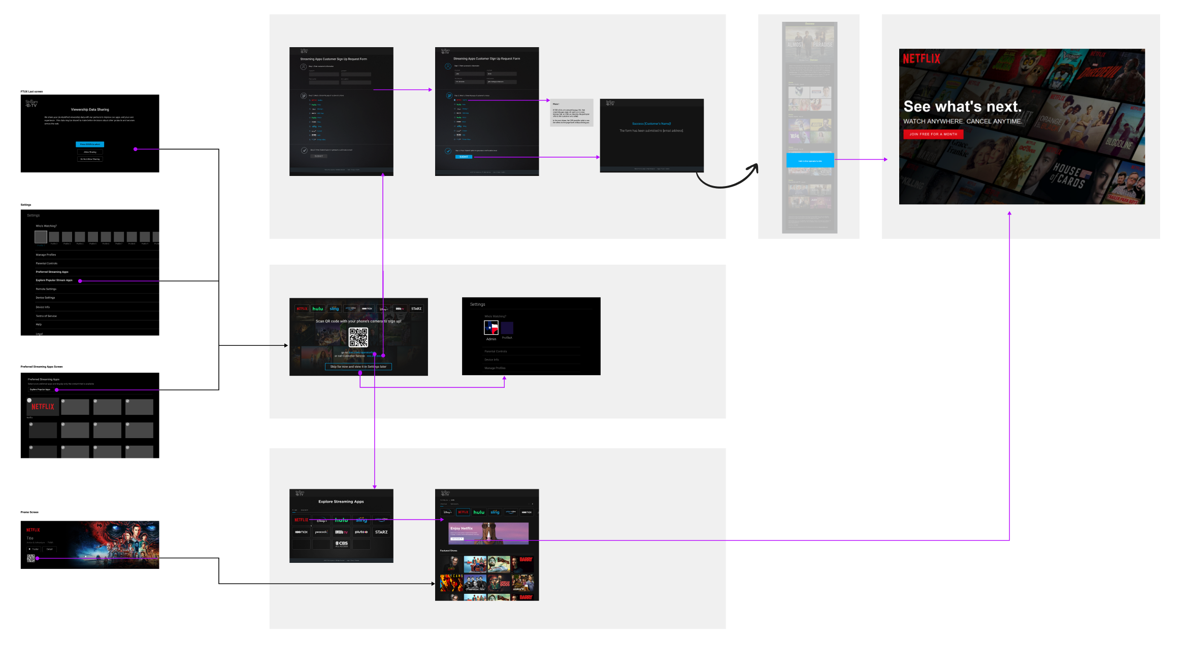 Gathered form the analytics and industry statistics, the highest dropout rate occurs when users are prompted to perform additional actions after booting up their devices. They prefer to immediately start enjoying their TV viewing experience rather than spending extra time on other tasks. My role was to design simple and effective methods that allows users, if they wish, to sign up for additional streaming services. The overarching goal was to accommodate all typers of user preferences.