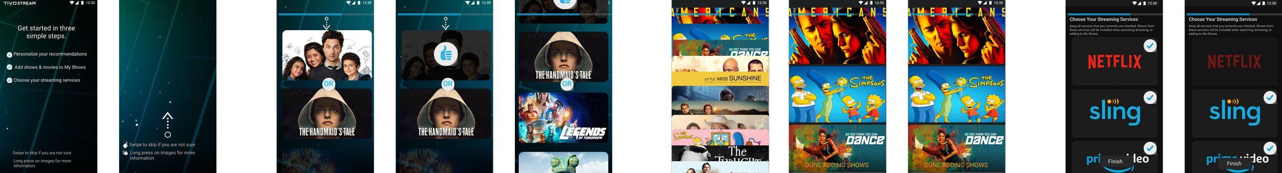 Instructions how to interact with show posters appear first. User can tap on a poster of their choice, the heart icon will appear and the poster will fly off the screen. Simple, engaging and fun way to progress the user through Step 1.